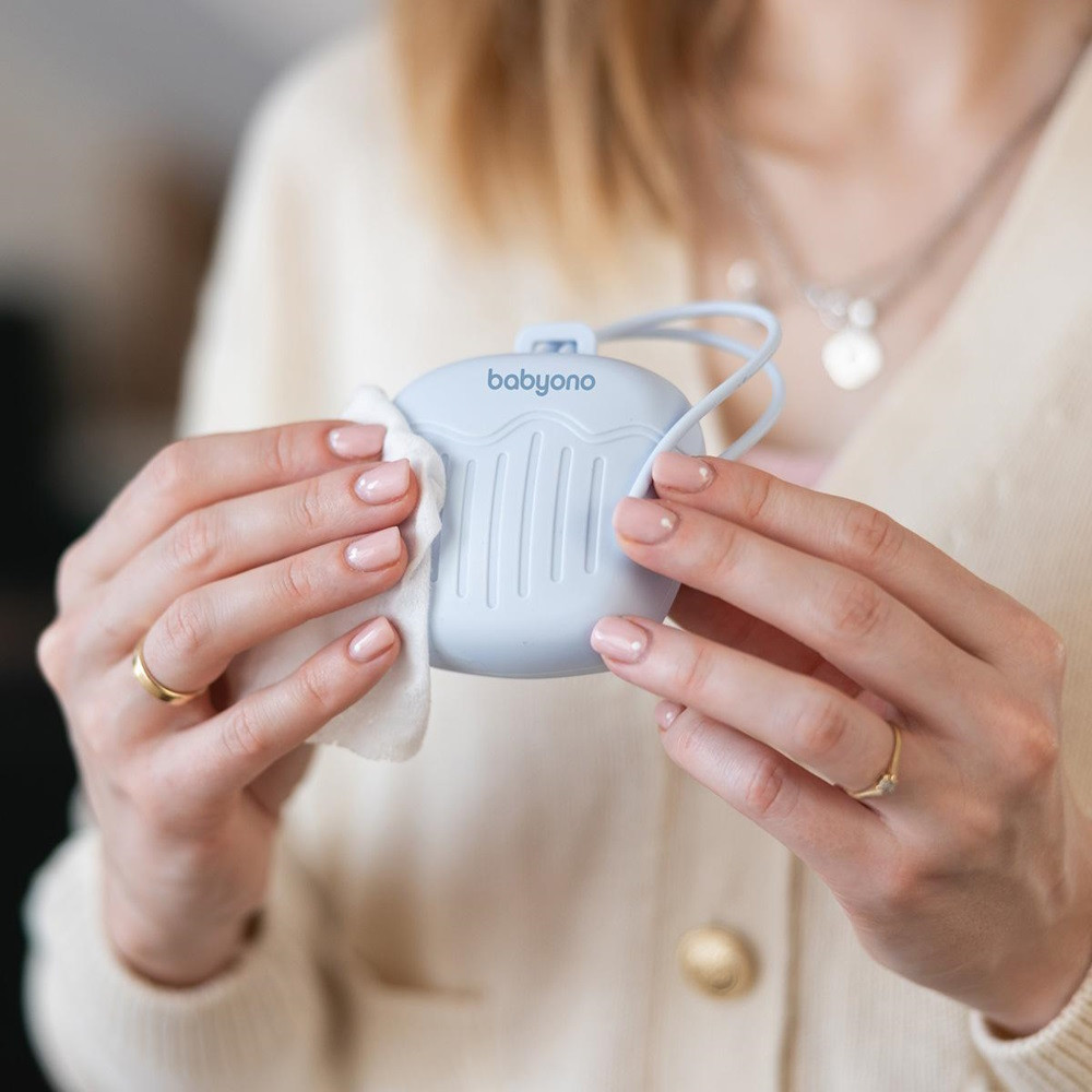 Csak nedves ruhával kell áttörölnöd a tokot; alternatívaként folyó víz alatt vagy mosogatógépben is elmoshatod. Így könnyen tisztán tarthatod a terméket, és higiénikus körülményeket biztosíthatsz a cumi tárolására.