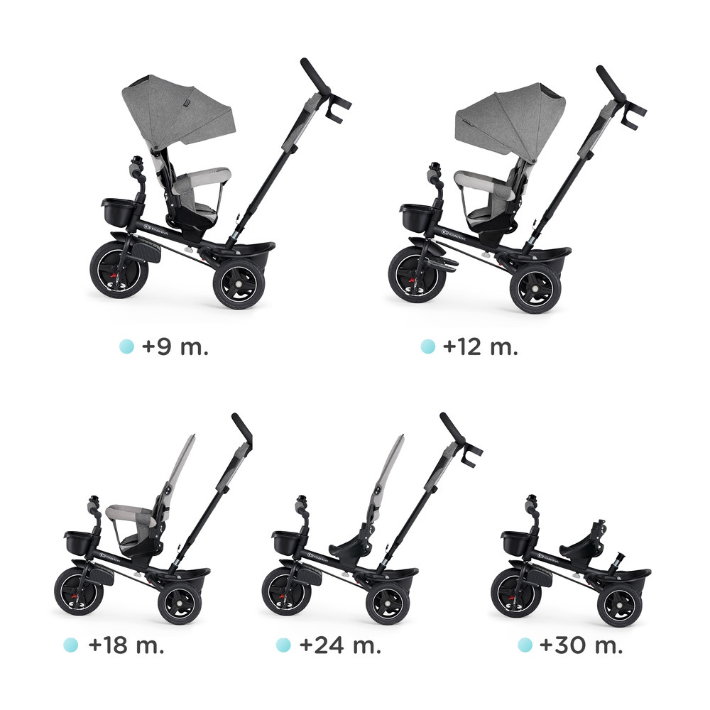 A tricikli 360 fokban forgatható üléssel rendelkezik, amelyet a szülõvel szembe és menetiránynak megfelelõen is beállíthatunk - a gyermek magabiztosabb lesz, ha tudja, hogy figyelsz rá. A mély, szabályozható, vízálló, és UPF50 szûrõvel ellátott kupolának köszönhetõen zápor és szél esetén is védelmet nyújt a gyermek számára, épp mint egy sportbabakocsi! A séta kényelméért a puha huzattal ellátott kényelmes ülés és a magas háttámla a felelõs. A háttámla megfelelõ támaszt nyújt a gyermeknek a világ felfedezése közben. A kistricikli 3 pontos biztonsági övvel és leszerelhetõ karfával lett ellátva, így ha gyermekünk készen áll, egyedüli utazásra is használhatja a triciklit.