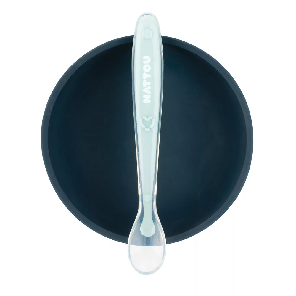 A Nattou kétrészes, puha szilikonból készült étkészlete nagyon praktikus, könnyen megfogható és csúszásgátlós. A készlet egy tapadókorongos tálat és egy kis kanalat tartalmaz. A tál lekerekített belsõ szélei megkönnyítik az ételek felvételét.