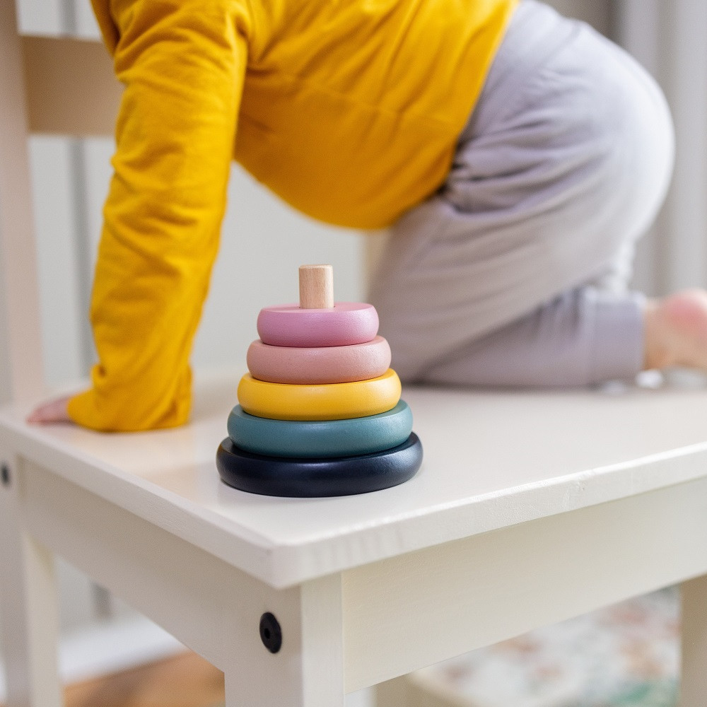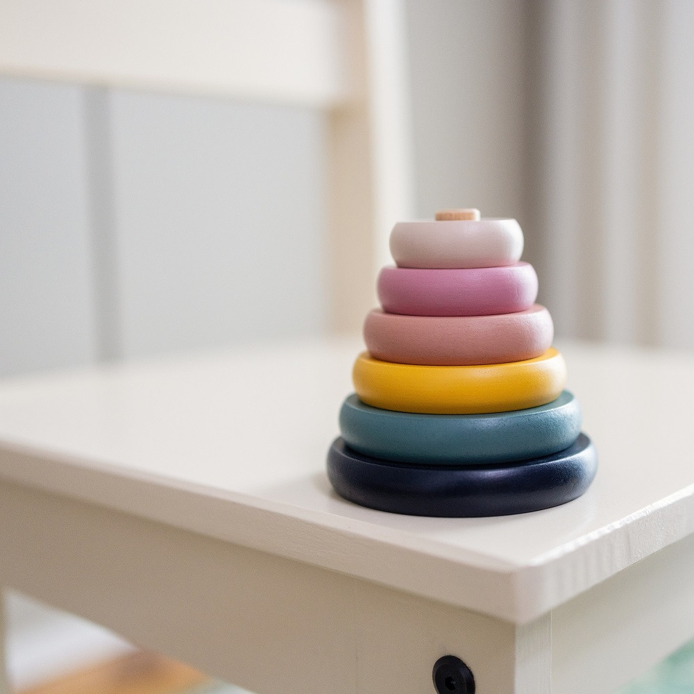 A piramis 6 színes korongból áll, amelyeket a gyermek egy henger