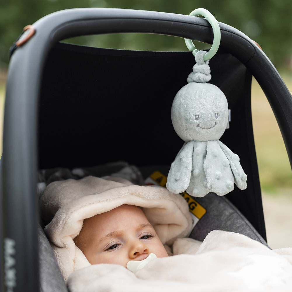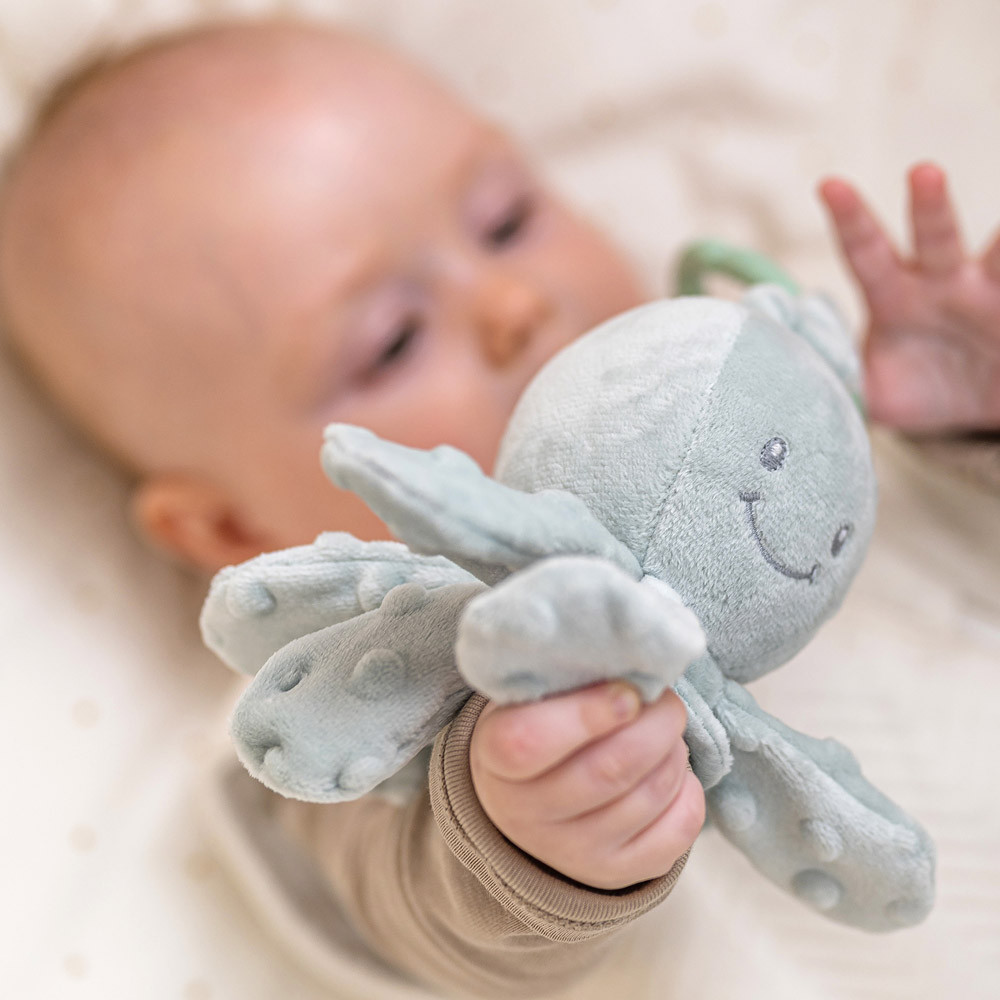 Nagyon cuki kis polip, ami felhúzva vibrálva megy felfelé. Gyorsan az újszülöttek és csecsemõk legjobb játszótársa lesz. Játékos és fejlesztõ játék egyaránt, serkenti a baba motoros készségeit és veleszületett prehenziós reflexeit. A csápok mind puhák, pont akkorák, mint a babák kicsi kezei, enyhe dudorokkal, amelyek felkeltik a kíváncsiságát és a tapintását. Koraszülötteknek is alkalmas, ideális a baba stimulálására.